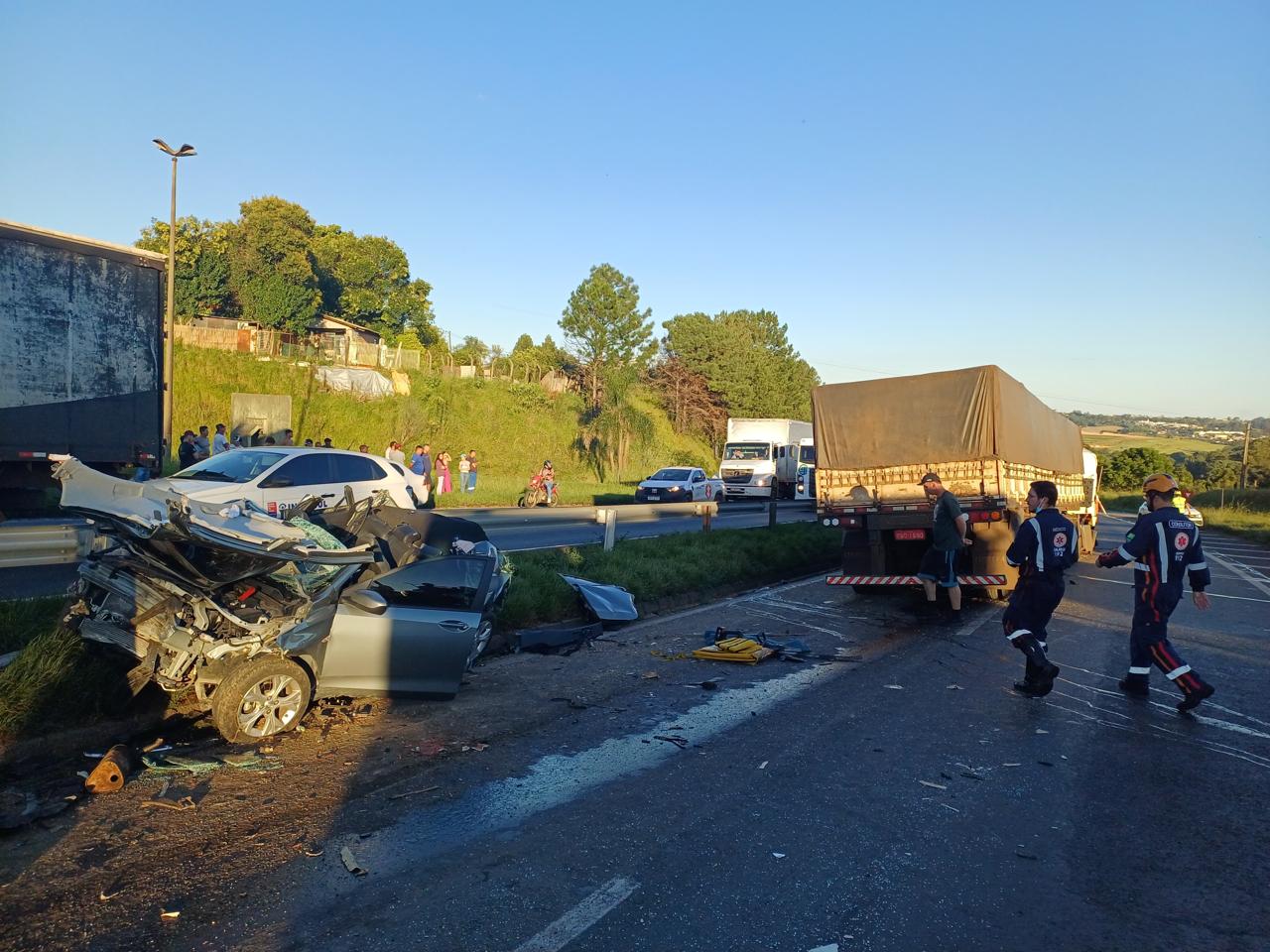 Um grave acidente de trânsito registrado na tarde desta quinta-feira (09) resultou em duas mortes e três pessoas feridas em Ponta Grossa. O sinistro ocorreu por volta das 16h, no km 484 da BR-376, sentido sul, nas proximidades do viaduto Santa Paula.