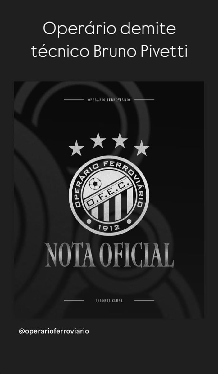 O Operário Ferroviário anunciou neste domingo (15), por meio das suas redes sociais, que Bruno Pivetti não é mais o treinador da equipe principal. Junto a ele seu auxiliar técnico, Ricardo Pagani, se desliga da equipe alvinegra. O desligamento do treinador ocorre um dia depois da derrota por 2 a 1 para o Athletic, na Arena Sicredi, em São João Del Rei, Minas Gerais.